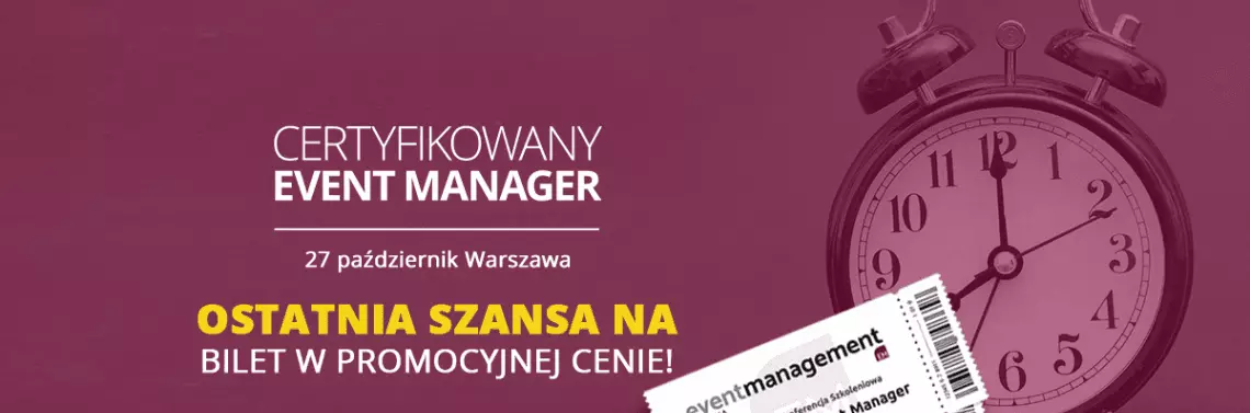 Słyszeliście już o Ogólnopolskiej Konferencji Szkoleniowej Event Menedżerów? Już 27 listopada w Warszawie spotkają się branżowi praktycy i specjaliści, by profesjonalnie przedstawić specyfikę pracy event managera. Nie zwlekajcie! Tylko do 14 października kupicie bilet w najniższej cenie.