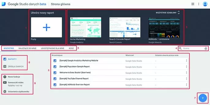 Ostatnią sekcję (8) stanowią zakładki, gdzie w szybki sposób sprawdzisz ostatnie aktualizacje, jakie miały miejsce w narzędziu (NOWE FUNKCJE). Jeśli dopiero uczysz się korzystać z Google Data Studio, pomocne okażą się SAMOUCZKI WIDEO, gdzie w przystępny sposób zaprezentowane są poszczególne funkcje narzędzia. Natomiast w USTAWIENIACH UŻYTKOWNIKA znajdziesz możliwość ustawienia powiadomień mailowych.