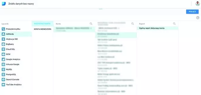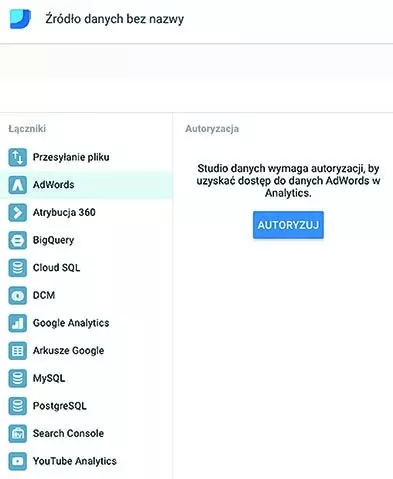 W lewej kolumnie widoczne są poszczególne łączniki, z których możesz korzystać, aby przygotowywać późniejsze raporty. W tym przykładzie posłużę się łącznikiem ADWORDS. Po jego wybraniu należy dokonać autoryzacji, która pozwoli narzędziu na korzystanie z danych z kont AdWords. Ważne jest, aby pod tym samym adresem mailowym, z którego korzystasz w Google Data Studio, znajdowały się konta AdWords, które zechcesz wykorzystać w procesie wizualizacji danych.