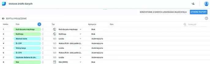 W nowym polu należy wpisać jego nazwę oraz formułę – w tym przypadku będzie to WARTOŚĆ WSZYSTKICH KONWERSJI-ZYSK (wykorzystujemy do tego symbole matematyczne, np. znak odejmowania). Identyfikator generowany jest dynamicznie i nie musisz nic zmieniać. Pozostaje teraz zapisać nowe pole, klikając UTWÓRZ POLE. Tworzenie wymiarów jest bardziej skomplikowane, a przykład, jak to zrobić, znajdziesz pod linkiem link. Jeśli nie chcesz dodawać nowych pól albo już to zrobiłeś, kliknij UTWÓRZ RAPORT. System wyświetli okno z potwierdzeniem użycia nowo utworzonego źródła danych w nowych raporcie – kliknij niebieski przycisk DODAJ DO RAPORTU i możesz przejść do najważniejszej części – tworzenia raportu.