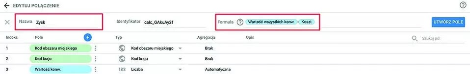 Jeśli brakuje Ci jakiegoś pola z konkretnymi danymi lub wymiarem, możesz dodać własne. W tym celu kliknij w ikonkę z plusem w kolumnie POLE. Dobrym przykładem może być ZYSK (rys. 6).