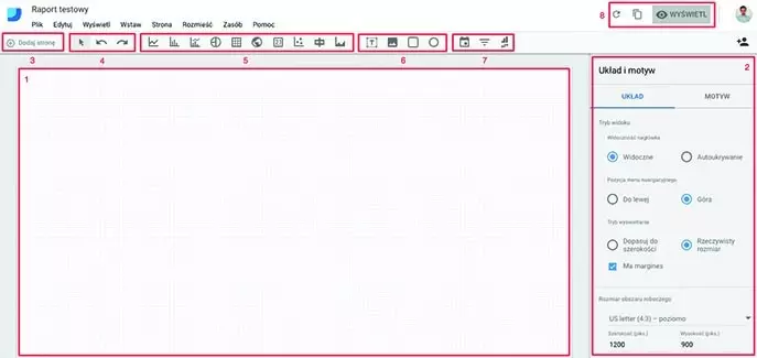 Nad obszarem roboczym znajdują się opcje, których będziesz używać do tworzenia raportu. Pierwszy przycisk od lewej (3) pozwala na dodanie kolejnych stron w raporcie (jeśli nie masz miejsca w obszarze roboczym na nowe dane, dodaj nową stronę i tam umieść kolejne elementy raportu).