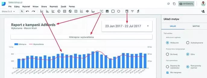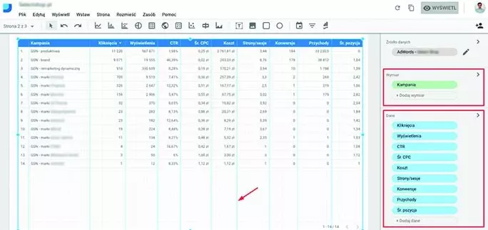 Rys. 8. Edycja elementów raportu (Źródło: datastudio.google.com)