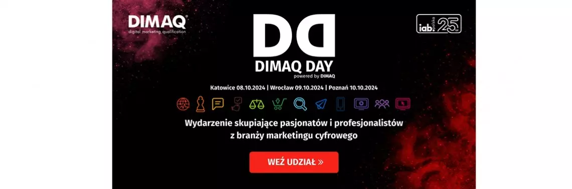 Z rewolucyjnymi zmianami w marketingu musi poradzić sobie każdy marketer – ten początkujący i ten doświadczony. Takie założenie towarzyszyło twórcom tegorocznego DIMAQ Day, konferencji cieszącej się opinią prawdziwego święta digital marketingu i jednocześnie jednego z najbardziej merytorycznych wydarzeń branży. Czołowi eksperci marketingu internetowego, social mediów, reklamy, technologii i biznesu w kilkunastu prelekcjach podzielą się praktyczną wiedzą, zaprezentują case studies i omówią rozwiązania z wielu różnych obszarów marketingu cyfrowego.