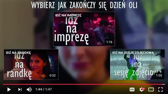 Zaletą komunikacji na YouTube jest brak nachalności w przekazie. Odbiorca trafia na dany kanał z wyboru i konsumuje treści, które niosą dla niego jakąś wartość. W utrzymaniu uwagi widza pomocne są wszelkiego rodzaju elementy zwiększające jego zaangażowanie, jak np. konkursy czy promocje, o których będzie mowa w materiale. Dobrym przykładem formatów wciągających widzów w świat filmu jest wideo interaktywne. Z takiej możliwości skorzystała marka Maybelline, która we współpracy z Aleksandrą Żuraw przygotowała wideo, w czasie którego każdy z oglądających może sam zadecydować, jak zakończy się dzień influencerki